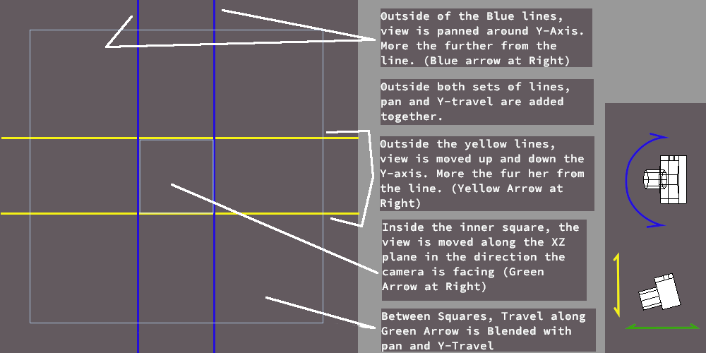 This mode is a slightly more flexable version of an old-school camera dolly. The viewpoint can rotate up and down, and to the left and right along a plane perpendicular to the Y-Axis.
