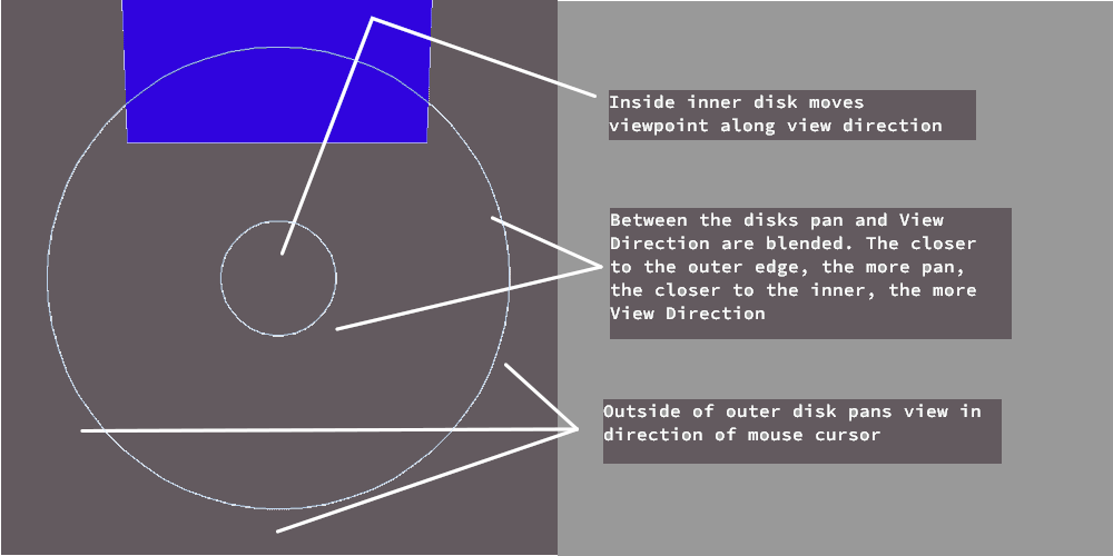 When the view control mode is one of the travel modes, (Drive or Fly) using the zoom control has a more complex effect. If the mouse cursor is at the center of the view, the zoom behaves as described in the applicable section above. Away from the center of the view, some additional features come into play.