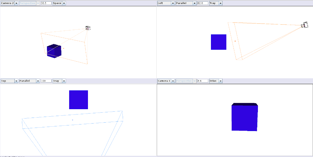 Note that the size and shape of the base of the pyramid represent the field of view that is shown in the ‘Camera 1’ viewport, but the camera itself looks off to infinity within that field of view.